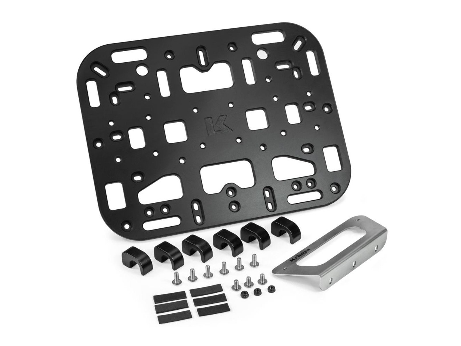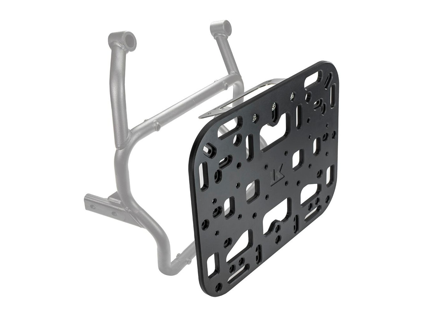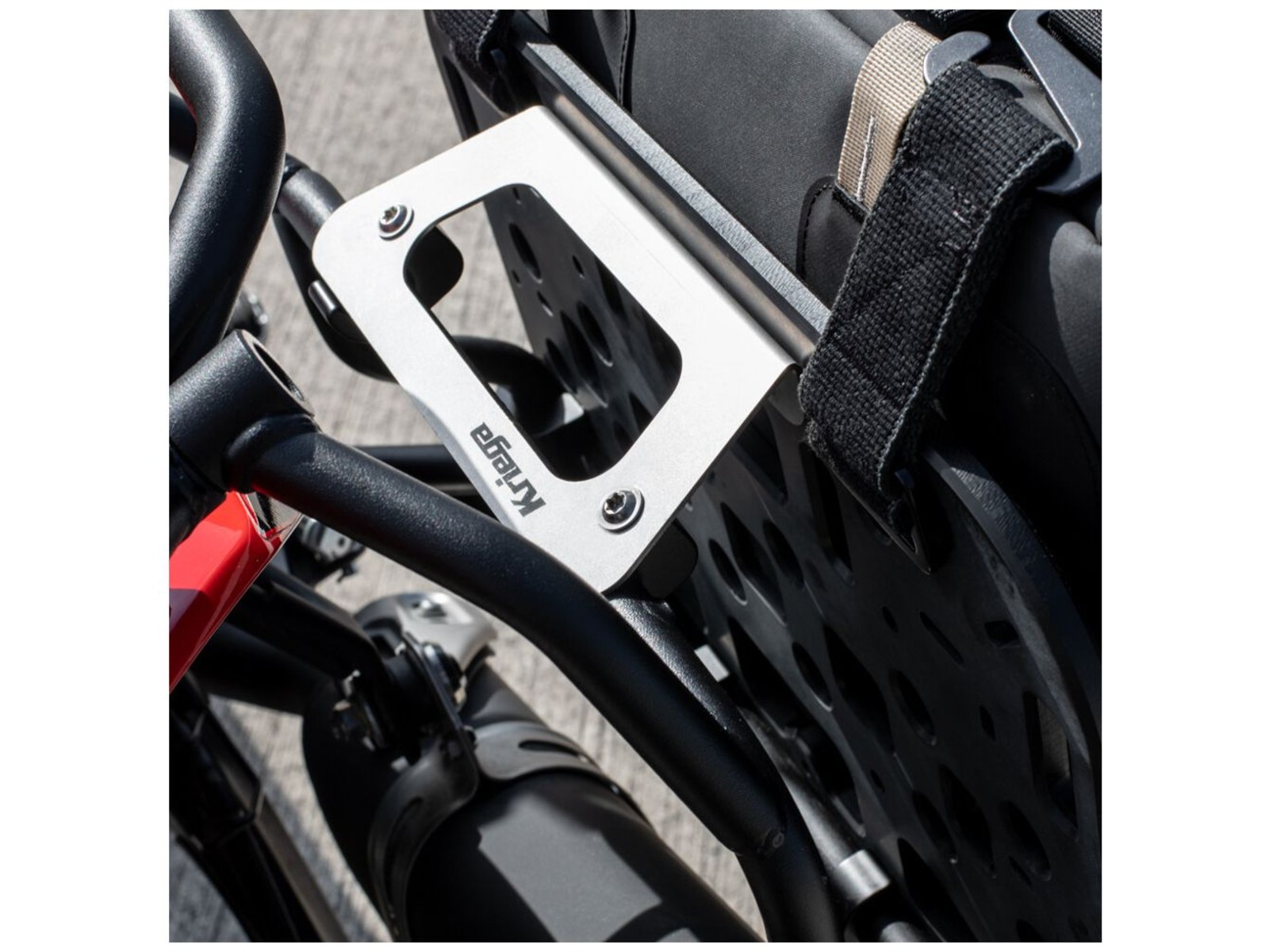 YAMAHA/GIVI pannier frames are designed to mount aluminium cases and do not have a standard flat profile on the exhaust side. This special edition OS-PLATFORM includes a stainless steel adaptor to flatten the profile and provide a strong mounting location for the OS-PLATFORM, which then gives you the option to mount Kriega ‘Soft Luggage’.