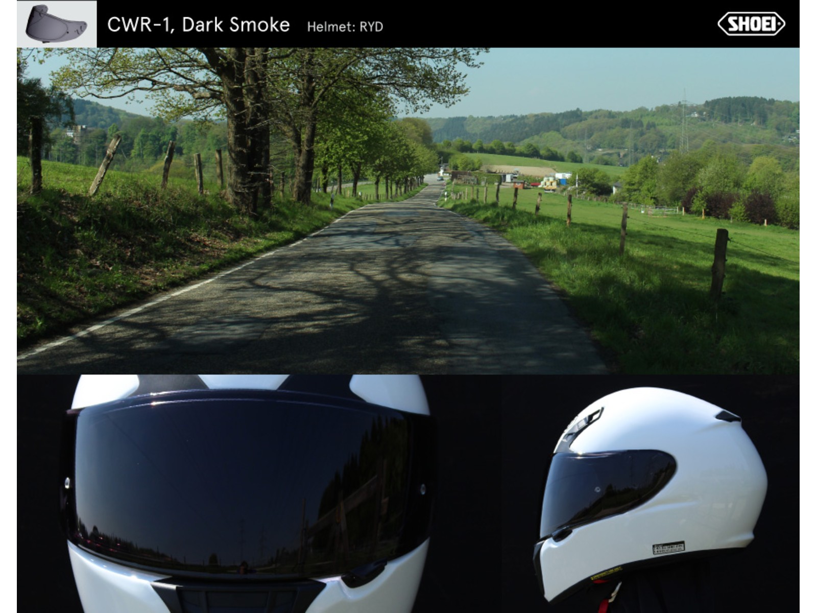 Note: The photo shows the tint level when the visor is mounted on the helmet. The visor appears lighter in the packaging, i.e. only after mounting it on the helmet is the visor almost pitch-black. This is the strongest tint available from Shoei.