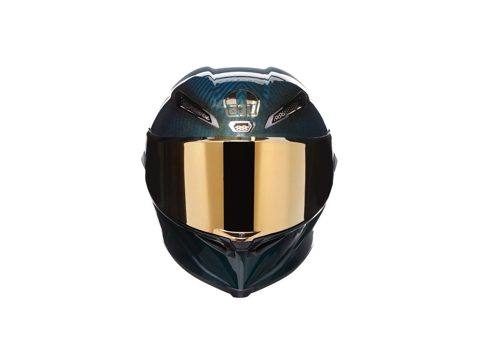 Gold und lässt ein Wechselspiel von Tiefe, Reflexionen und Glanz entstehen, das für Bewegung und visuelle Dynamik sorgt. Schwarz verchromte Lufteinlässe, goldglänzende Gitter und ein schwarz schimmernder Spoiler betonen die Linien des Helms, und das leuchtende sowie kühne Iridium-Gold-Visier setzt einen letzten markanten Akzent.