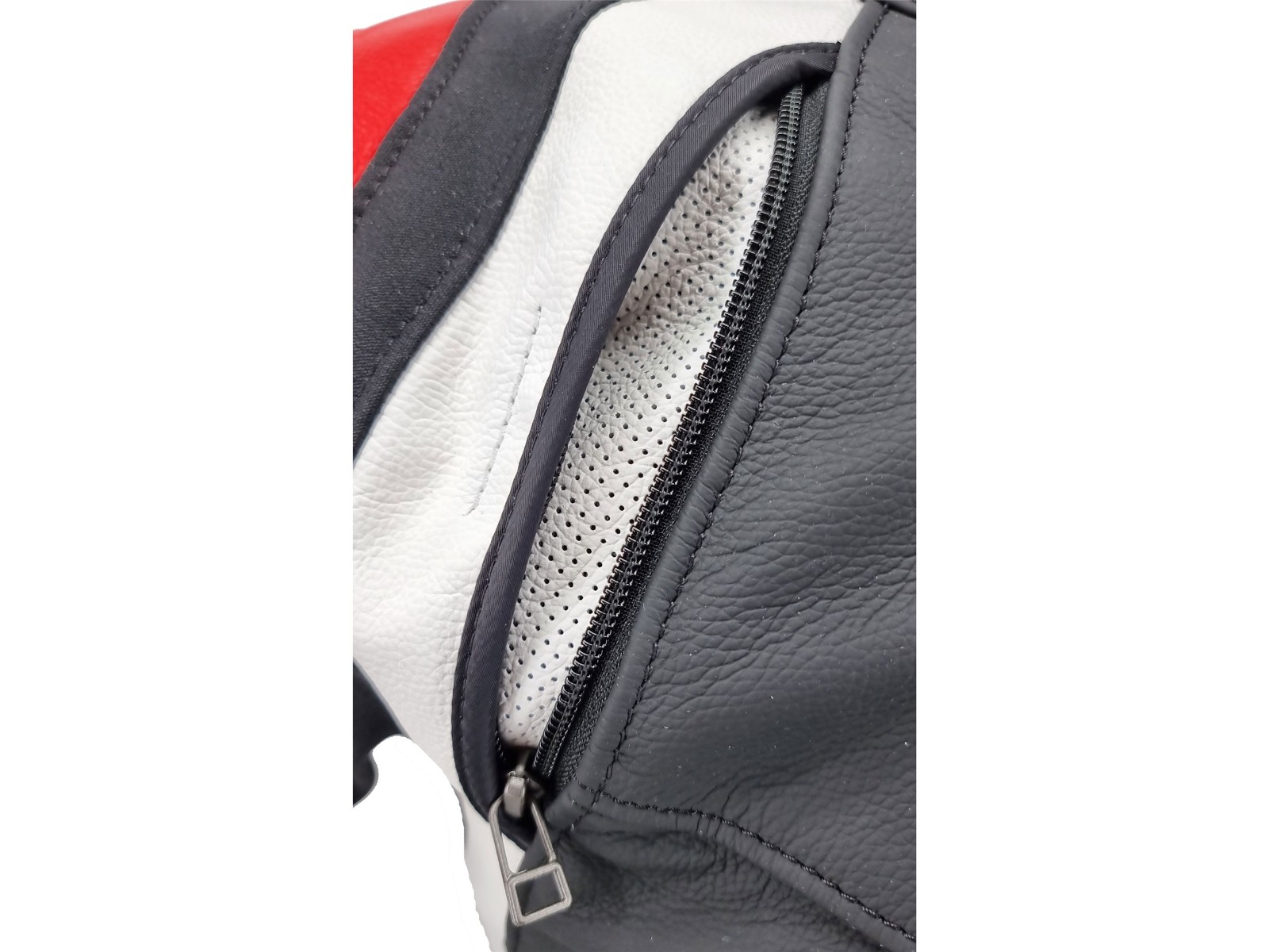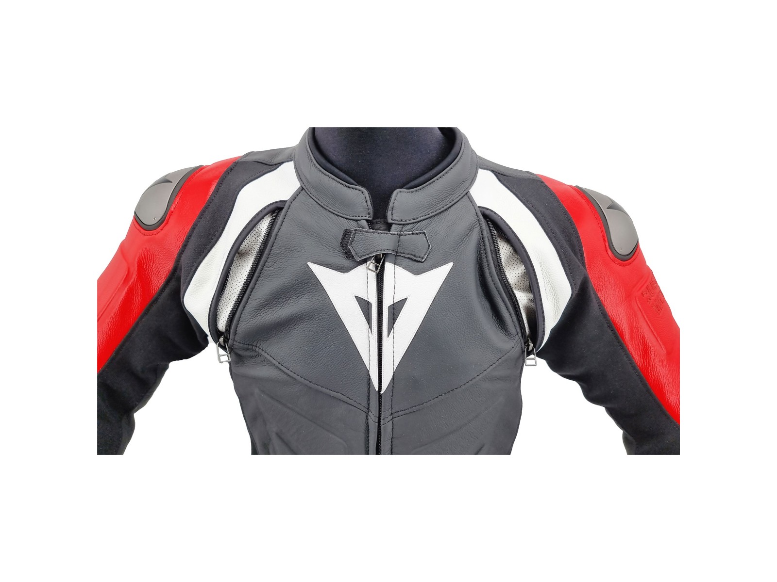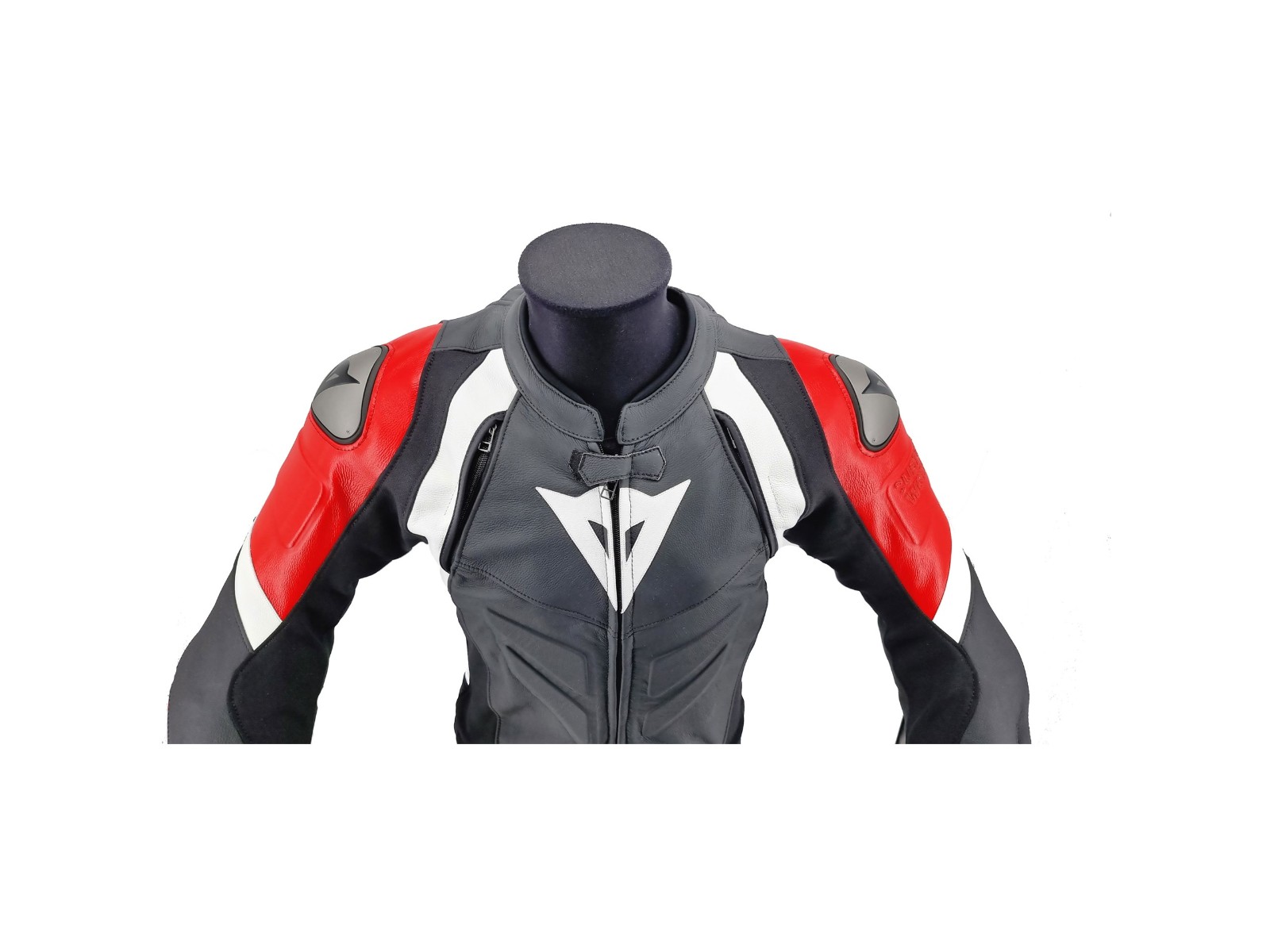 - Zweiteiliger Motorradanzug Dainese Avro 4 aus edlem Tutu-Rindsleder, bestehend aus einer Jacke und einer Hose, die durch einen bequemen und widerstandsfähigen Reißverschluss rund um die gesamte Taille verbunden sind. Optimiert für das Fahren auf der Straße, geeignet für alle Geländearten.Der maximale Schutz wird durch Protektoren aus Verbundmaterial an Knien, Ellbogen und Schultern und weiche Pro-Shape 2.0-Protektoren an der Hüfte gewährleistet und kann durch Innentaschen zum Einsetzen von Brustprotektoren weiter erhöht werden. Avro 4 ist mit abnehmbaren und austauschbaren Slidern an den Knien und austauschbaren Aluminiumplatten an den Schultern ausgestattet: eine besondere Technologie von Dainese, die das Rutschen im Falle eines Sturzes unterstützt und begünstigt und so gefährliche Überschläge aufgrund von Haftung auf dem Asphalt verhindert. Der Höcker an den Schultern und im Nacken hat eine aerodynamische Funktion.Für zusätzlichen Komfort während der Fahrt verfügt der zweiteilige Anzug Avro 4 über breite Einsätze aus S1-Stretchgewebe an der Arminnenseite, an den Leisten und der Beinrückseite, Einsätze aus Microelastic 2.0-Leder am Rücken und an den Armen, die die Bewegungsfreiheit erhöhen und gleichzeitig den Schutz von Leder bieten, sowie verstellbare Lüftungsschlitze mit Reißverschluss an der Brust.Die Aerodynamik und die Stabilität des Stiefels können durch die patentierte Doppelreißverschluss-Konstruktion am Beinsaum maximiert werden, die den unteren Teil verbreitert und es ermöglicht, den IN-Stiefel dank Klettverschluss innen zu fixieren.