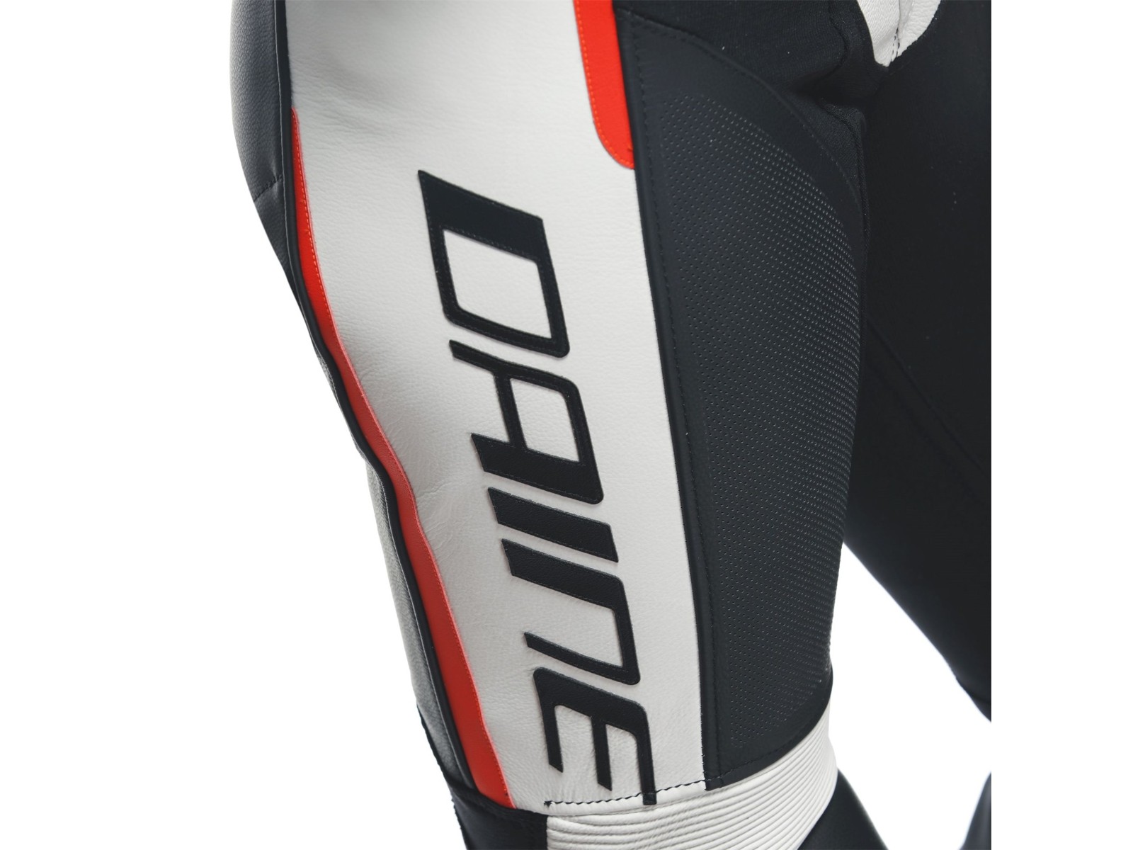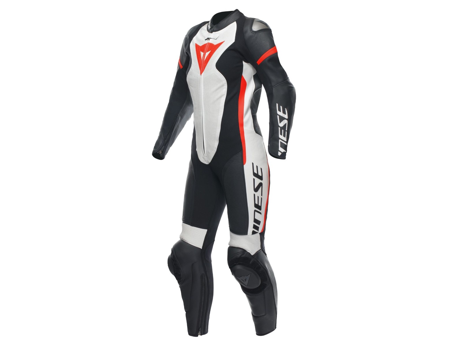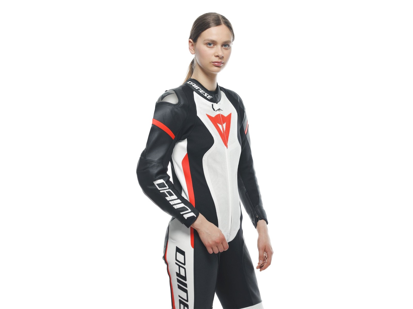 - Motorradanzug aus Leder mit lokalisierter Perforierung und spezieller Passform für Damen. Extrem schützend dank der Verbundprotektoren, und bequem dank der elastischen Einsätze. Geeignet für das Fahren auf der Rennstrecke.