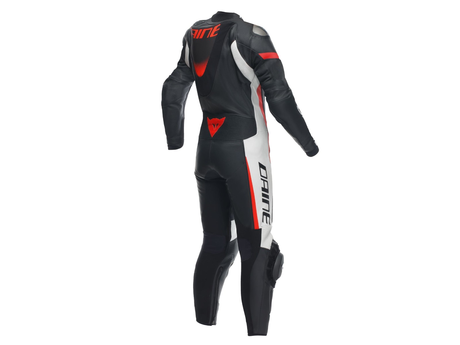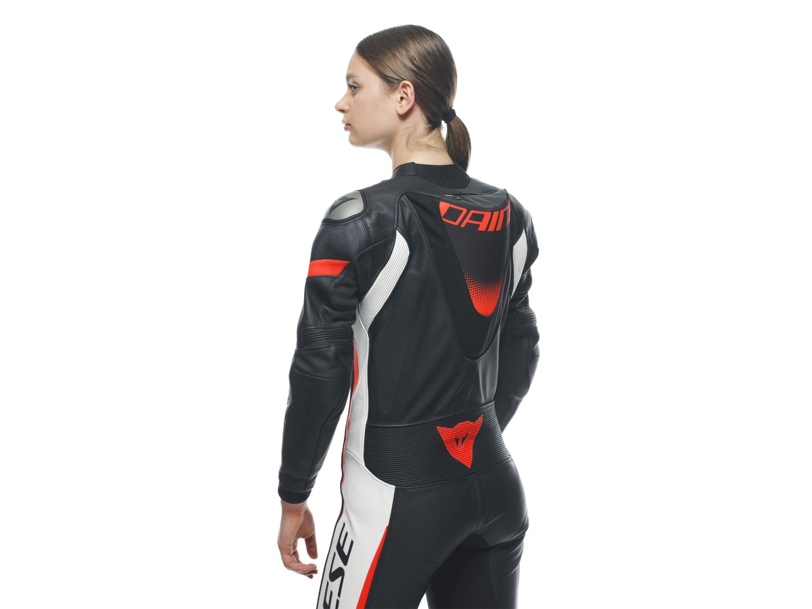 - r professioneller Anzug, der perfekt an die Formen des weiblichen Körpers angepasst wurde. Die spezielle Passform und die perfekte Ergonomie sorgen für eine gute Tragbarkeit und einen hohen Bewegungskomfort im Sattel, so dass sich die Rennfahrer nur auf das Fahren konzentrieren können.Der aus Tutu-Rindsleder gefertigte Damenanzug Grobnik Lady Leather Suit garantiert dank der Verbundprotektoren an Schultern, Ellbogen und Knien, der weichen, Pro-Shape 2.0-Protektoren an der Hüfte und der austauschbaren Aluminiumplatten an den Schultern, einem Markenzeichen von Dainese, ein Höchstmaß an Schutz, der aus der direkten Erfahrung auf der Rennstrecke resultiert. Metalleinsätze an den Schultern unterstützen das Rutschen im Falle eines Sturzes und verhindern gefährliche Überschläge.Ein hohes Schutzniveau geht Hand in Hand mit maximalem Fahrkomfort: Die breiten Einsätze aus elastischem Gewebe sorgen für einen hohen Bewegungskomfort, und das atmungsaktive Futter mit Einsätzen aus 3D Bubble-Gewebe macht den Anzug extrem vielseitig und optimal auch bei wärmerem Klima, vor allem dank der lokalisierten Perforierung an den strategisch wichtigsten Stellen des Anzugs.Die Jacke ist für das Einsetzen des Waterbag Kit im Inneren des aerodynamischen Höckers vorgerüstet, ein System, das eine Wasserflasche umfasst, die an das Trinksystem des Helms angeschlossen werden kann und somit die Möglichkeit bietet, zu trinken, ohne das Fahren zu unterbrechen, was den Grobnik Leather Suit äußerst praktisch und funktionell macht.