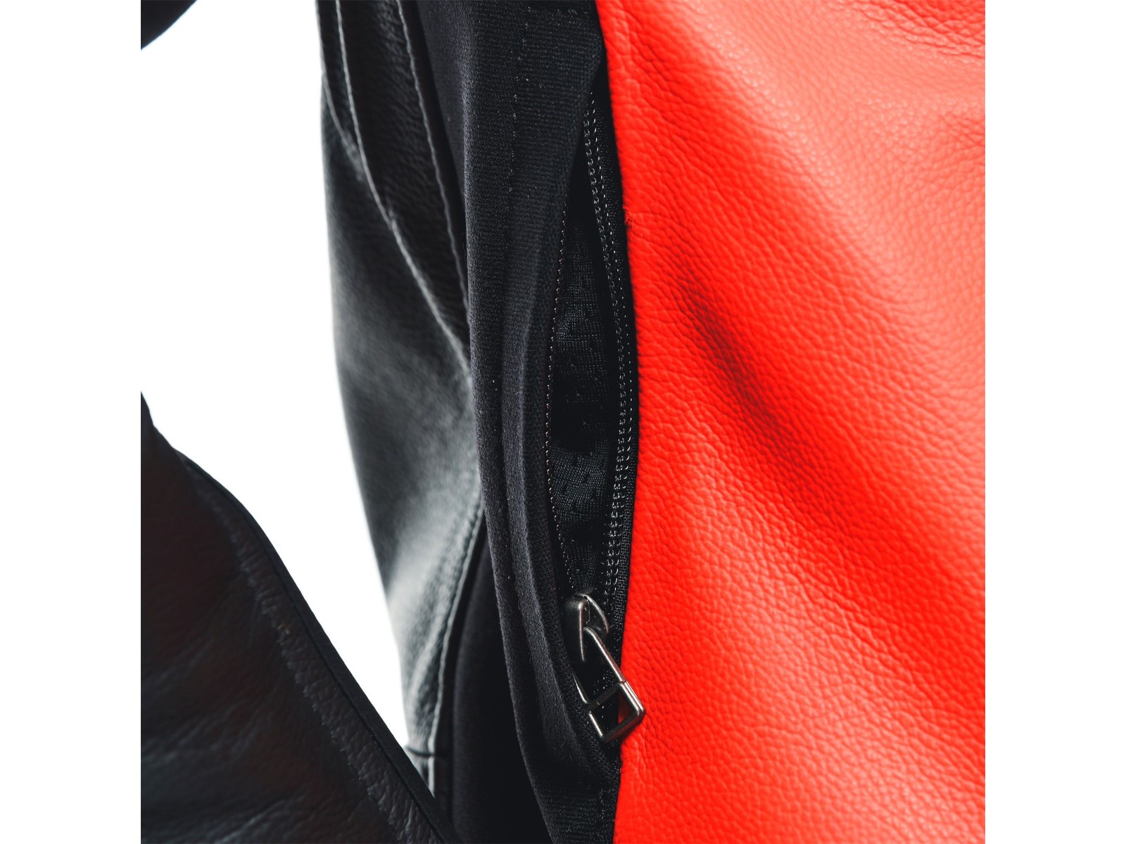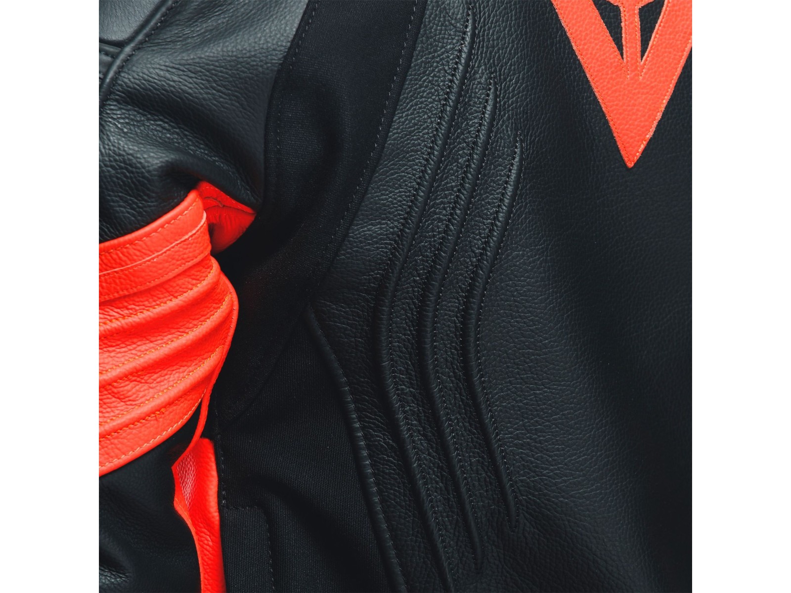 - Motorradlederjacke Racing 4, eine Ikone der Dainese-Kollektion, mit athletischer, eng anliegender Passform, die zu einem sportlichen Fahrstil passt. Sie ist aus edlem TUTU-Rindsleder mit Nanofeel®-Futter gefertigt und verfügt über vier Lüftungsschlitze, zwei an der Hüfte und zwei auf der Brust, für maximalen thermischen Komfort. Anliegender Sitz und Flexibilität werden durch ein System zur Regulierung der Passform an der Hüfte, Bereiche aus 2-Wege-Stretchgewebe S1 und Einsätze aus Microelastic 2.0-Leder am Rücken und an den Armen gewährleistet. Dadurch wird die Bewegungsfreiheit erhöht, während gleichzeitig der für Leder typische Schutz erhalten bleibt.Die Motorradjacke Dainese Racing 4 verfügt über einen Reißverschluss am Saum, der es ermöglicht, sie mit der Motorradhose zu verbinden, sowie über nach EN 1621.1 Protektoren aus Verbundmaterial an Ellbogen und Schultern, wobei letztere zusätzlich durch austauschbare externe Aluminiumplatten – eine besondere Technologie von Dainese – geschützt werden: Diese unterstützen und erleichtern das Rutschen im Falle eines Sturzes und verhindern so gefährliche Überschläge auf dem Asphalt.