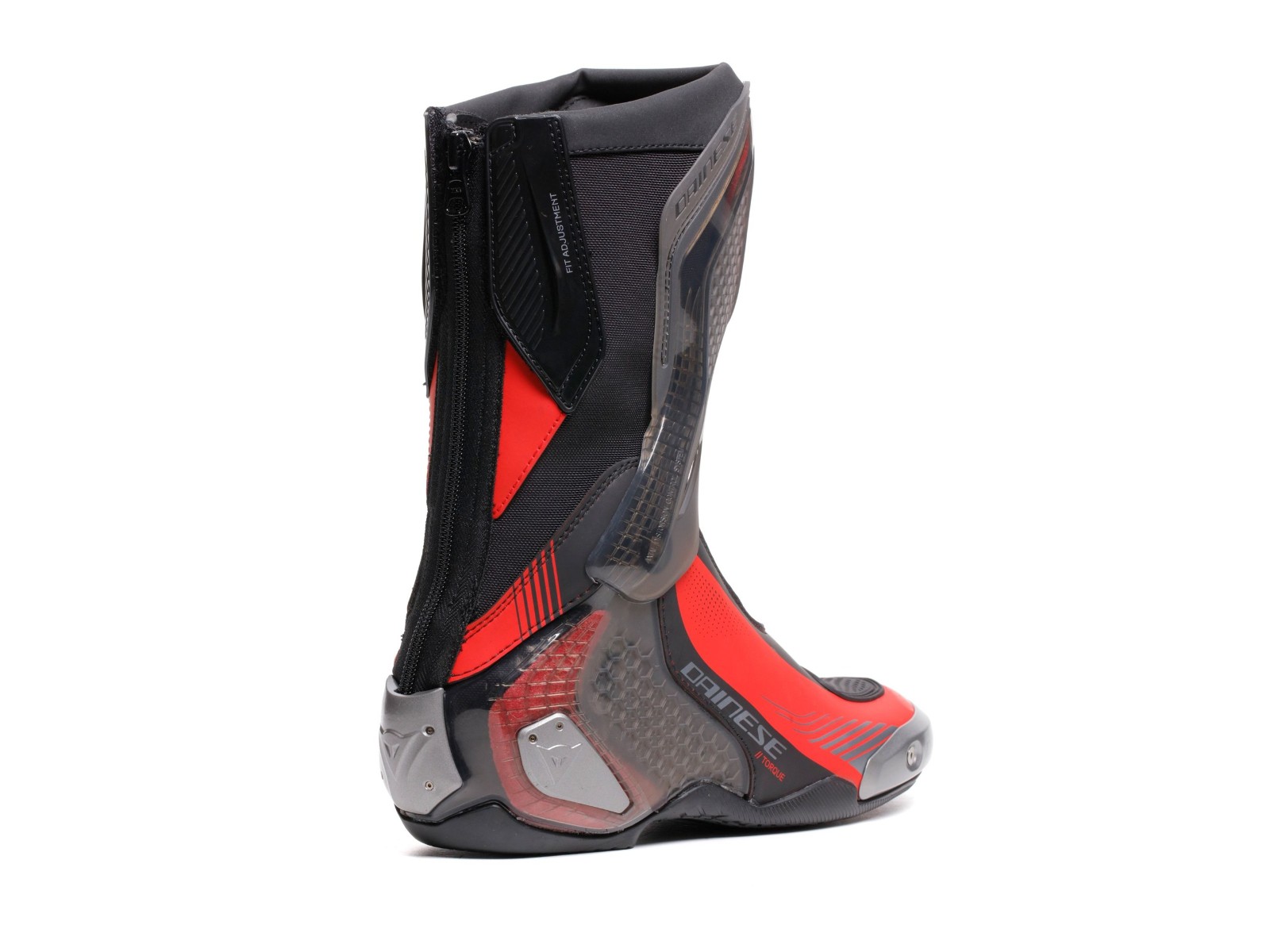 Hergestellt aus Mikrofaser und D-Stone™-Gewebe mit griffigem TPU D-Axial-System, garantieren diese Rennstiefel, inspiriert vom Spitzenmodell Dainese Axial 2, maximalen Komfort und hohe Schutzstandards bei gleichzeitiger Beibehaltung eines sportlichen und attraktiven Designs, das durch die Integration von durchsichtigen Kunststoffeinsätzen, die einen Blick auf die darunter liegenden Stoßdämpfer ermöglichen, noch verstärkt wird.Das elastische D-Stone™-Gewebe sorgt für maximale Widerstandsfähigkeit und einfache Passform. Die Magnesiumschieber an Zehen und Ferse sind austauschbar, eine Lösung, die auch den Austausch des Reißverschlusses ermöglicht, falls dieser kaputt geht. Höchste Sicherheit an Schienbein und Ferse gewährleistet das D-Axial-System, das im Falle eines Sturzes für eine bessere Stoßdämpfung sorgt und zudem ein äußeres grafisches Muster aufweist, das an den Pro-Amor 2 erinnert. Die innovative asymmetrische Groundtrax®-Sohle mit differenzierten Schalt- und Bremsbereichen garantiert Grip und Hitzebeständigkeit – ein wahrer Meister der Leichtigkeit und Leistung, um sich sowohl auf der Straße als auch auf der Rennstrecke voll und ganz zu entfalten.