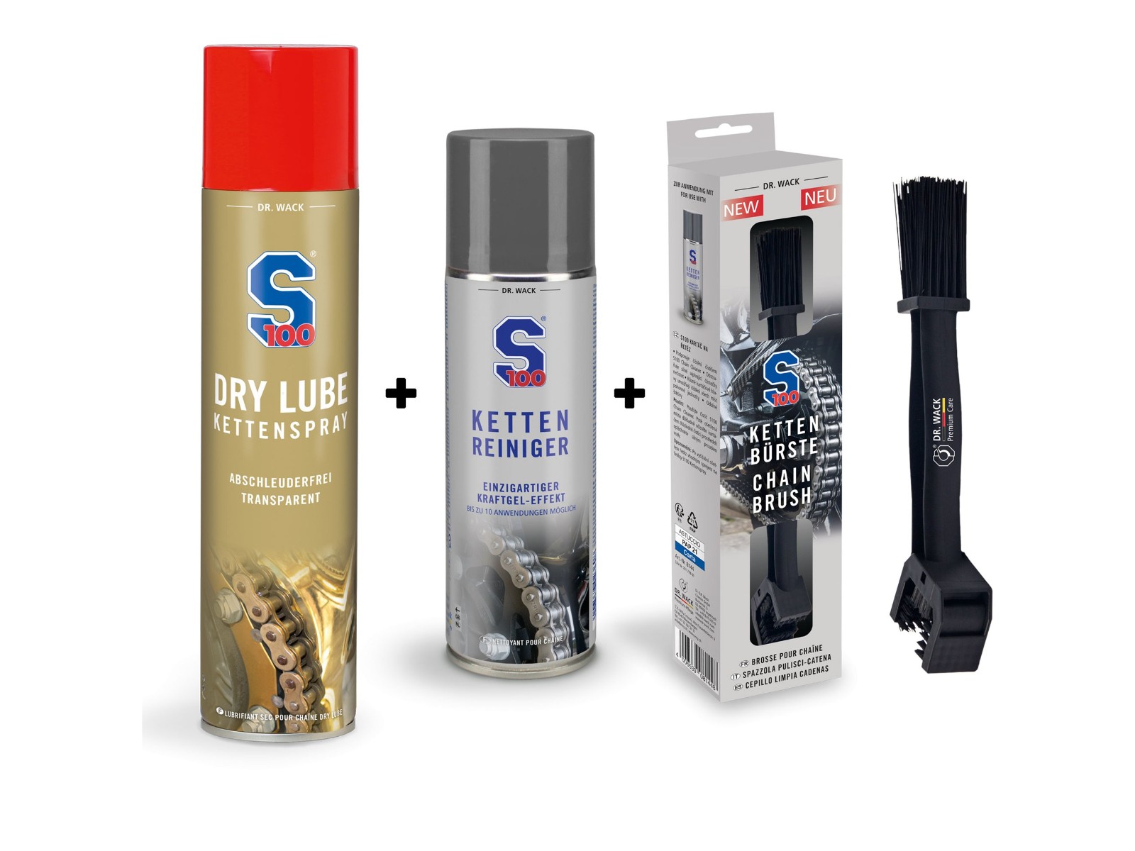 S100 Ketten-Pflege Dry Lube Set 2 (S100 Dry Lube 400ml + Kettenreiniger Kraft-Gel 300ml + Bürste)