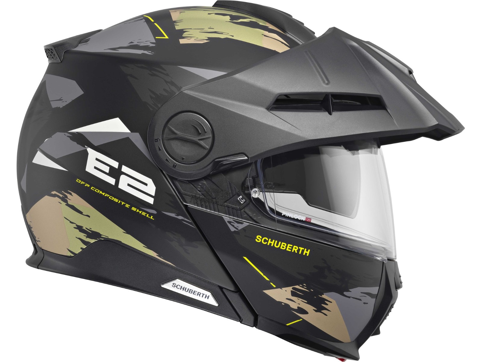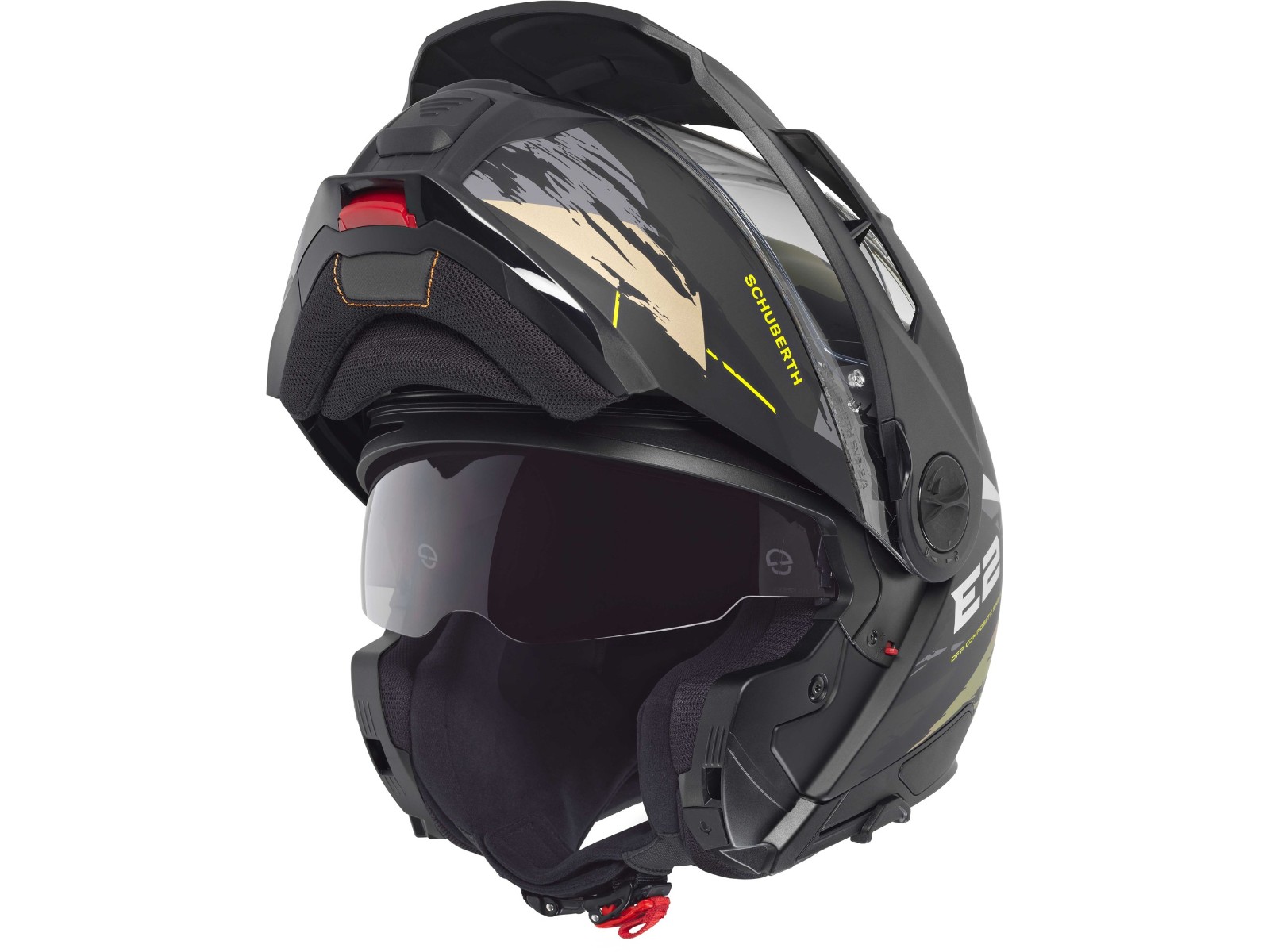 R 22.06 Norm entspricht. Der SCHUBERTH E2 ist die perfekte Mischung zwischen dem Komfort der berühmten „C“ Serie und dem aggressivem Aussehen eines Offroad-Helms. Die anpassbare Innenpolsterung bietet eine perfekte Passform für alle Kunden und hebt diesen Adventure-Helm auf ein neues Level, bereit, die staubigsten Wege zu rocken.