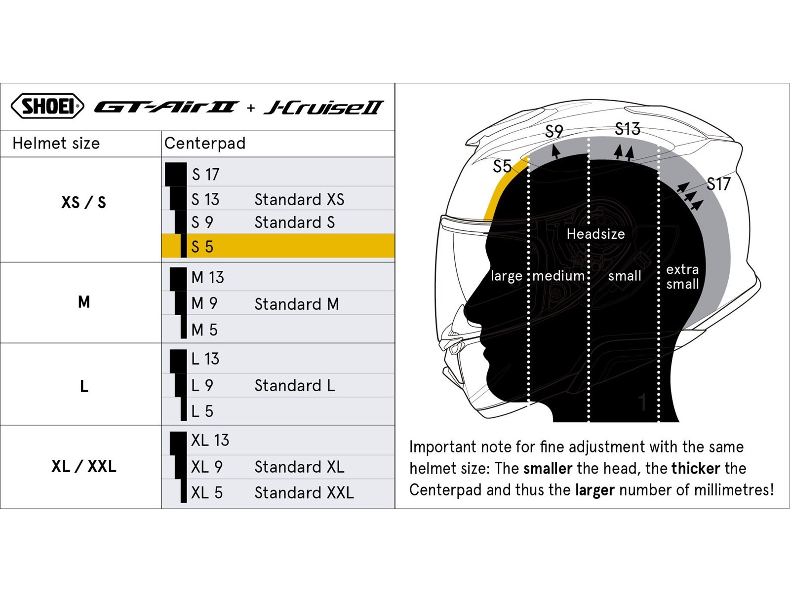 Kopfpolster in unterschiedlichen Größen können zum Ersatz des Originalpolsters oder zur individuellen Anpassung des Helmes im Oberkopfbereich eingesetzt werden. Die Polster eines Helmmodells sind im Rahmen ihrer Größenzuweisung, z.B. "M5" – "M9" – "M13", austauschbar. "M5" steht dabei für ein dünneres, "M13" für ein dickeres Polster, wie im nachfolgenden Schaubild ersichtlich.