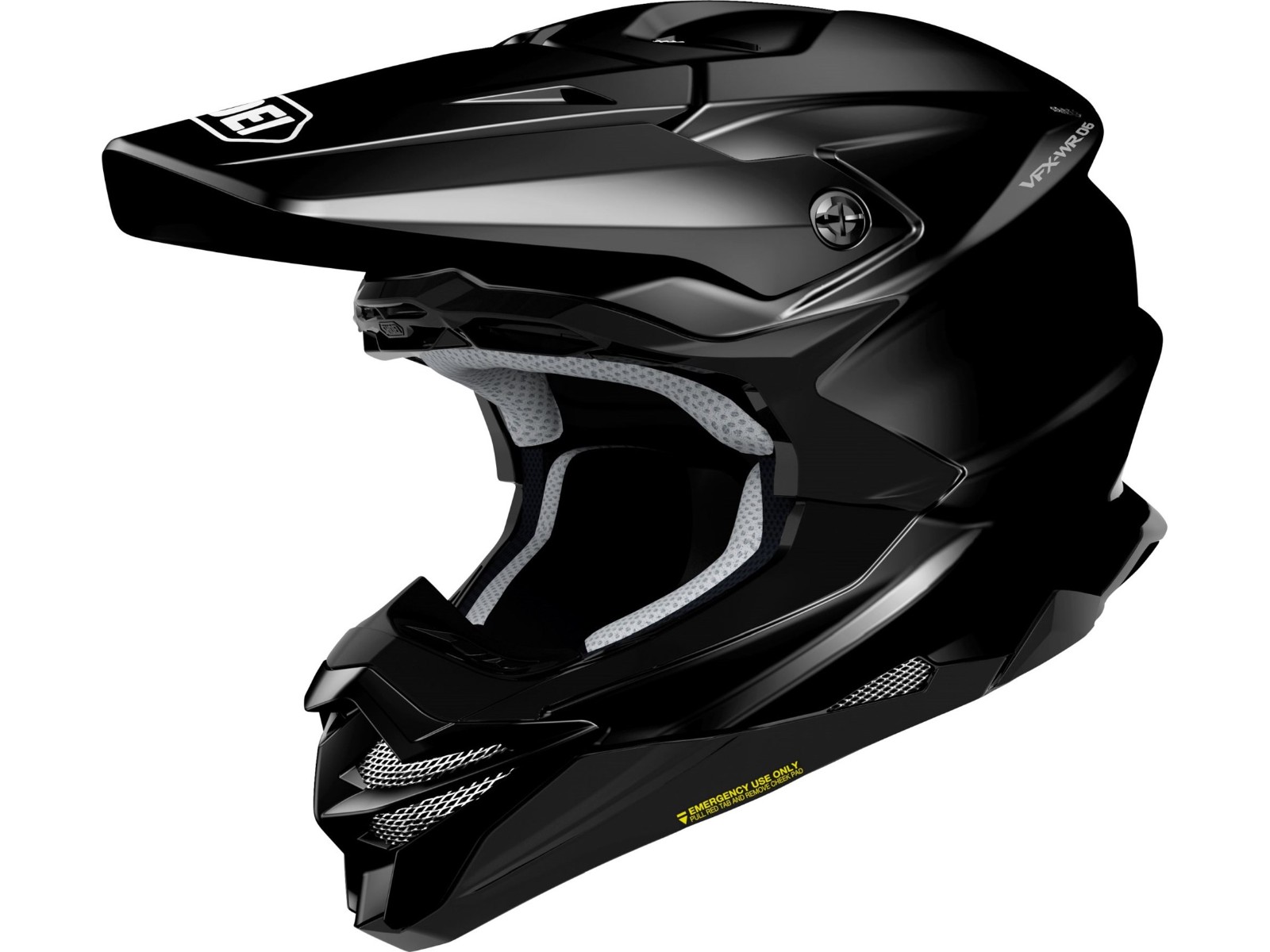 Mit dem VFX-WR 06 in klassischem schwarz legt Shoei eine Legende neu auf. Der brandneue VFX-WR 06 Motocross oder Enduro Helm verfügt nun über die neueste Homologation der ECE 22/06. Modernste Schalenbautechnik ermöglicht die Formgebung für eine hochstabile und zugleich leichte Helmschale mit futuristisch-aggressiver Optik. Durchgängige Konturen vom Schirm über die Helmschale hinweg bis zum Hinterkopf sorgen für Stabilität der Schale, perfekte Führung des Brillenbandes und einen unvergleichlichen Look. Das neue, integrierte Sicherheitssystem M.E.D.S. (Motion Energy Distribution System) sorgt bei einem Sturz für bestmögliche Reduzierung der Rotationsenergie.