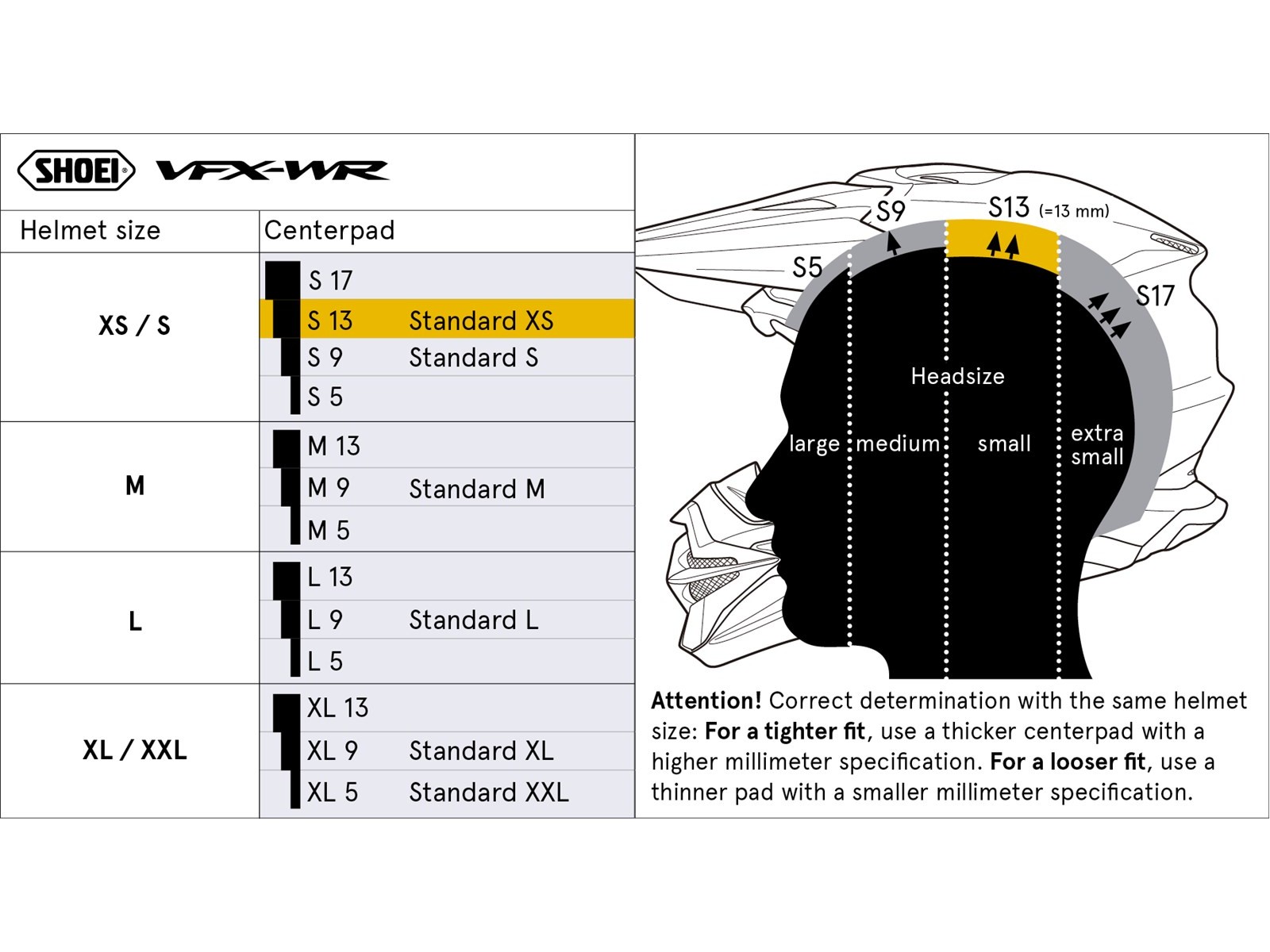 Kopfpolster in unterschiedlichen Größen können zum Ersatz des Originalpolsters oder zur individuellen Anpassung des Helmes im Oberkopfbereich eingesetzt werden. Die Polster eines Helmmodells sind im Rahmen ihrer Größenzuweisung, z.B. "S5" – "S9" – "S13", austauschbar. "S5" steht dabei für ein dünneres, "S13" für ein dickeres Polster, wie im nachfolgenden Schaubild ersichtlich.