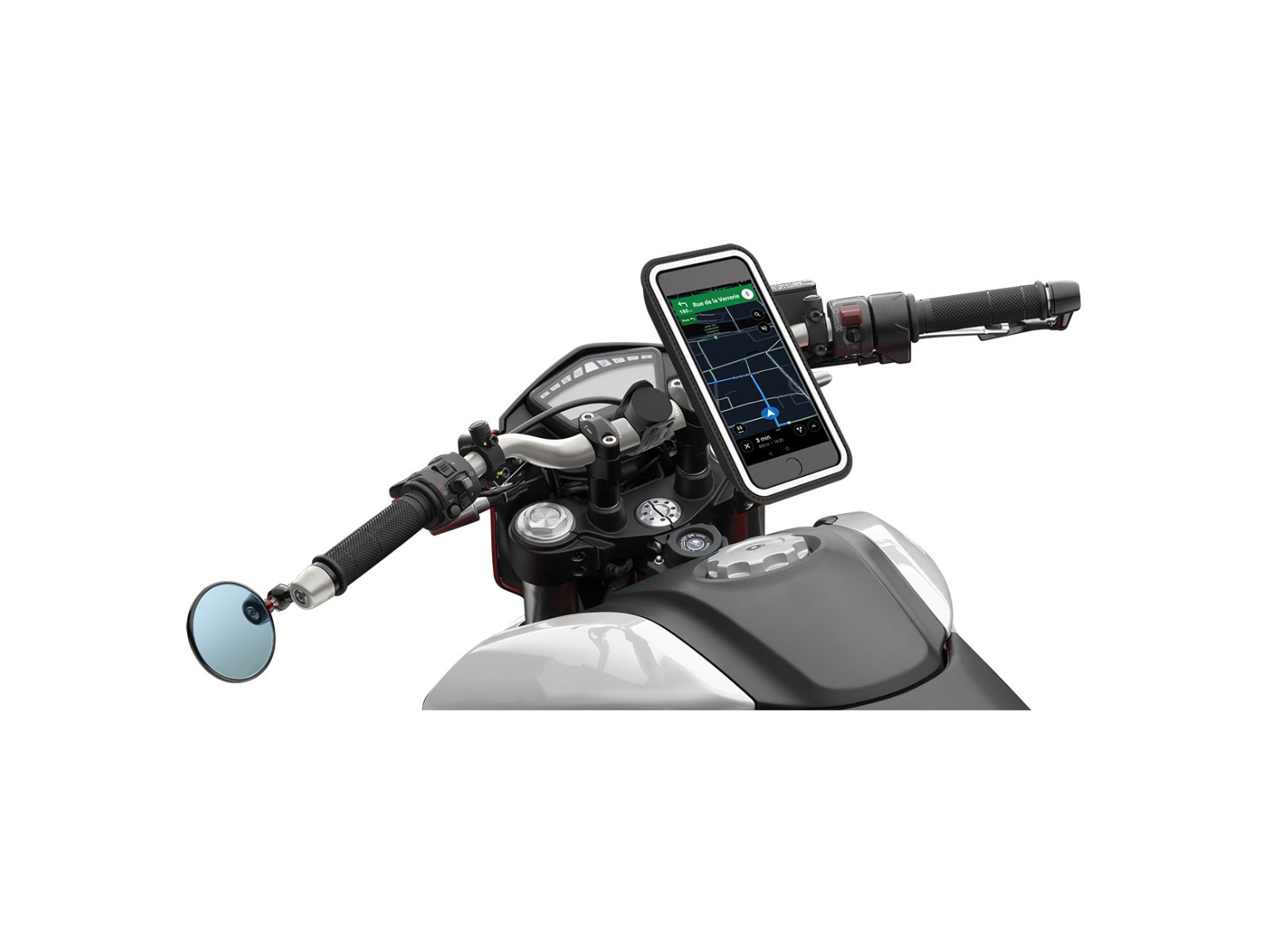 - Dank seiner Textiltasche, seiner Befestigung und seiner Silikonbasis absorbiert unsere Halterung mehr als 50 % der Motorvibrationen, und bis jetzt haben wir die Kamera von absolut 0 Handys gebrochen.
