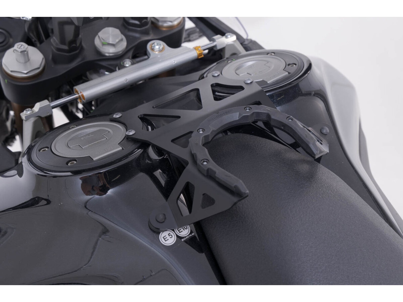 Der PRO Tankring der Ténéré 700 World Raid sitzt auf einem modellspezifischen Anbauelement, das an den beiden Tankeinfüllstutzen befestigt ist. Das Anbauelement ist auf dem Tank des Motorrads fest verschraubt.