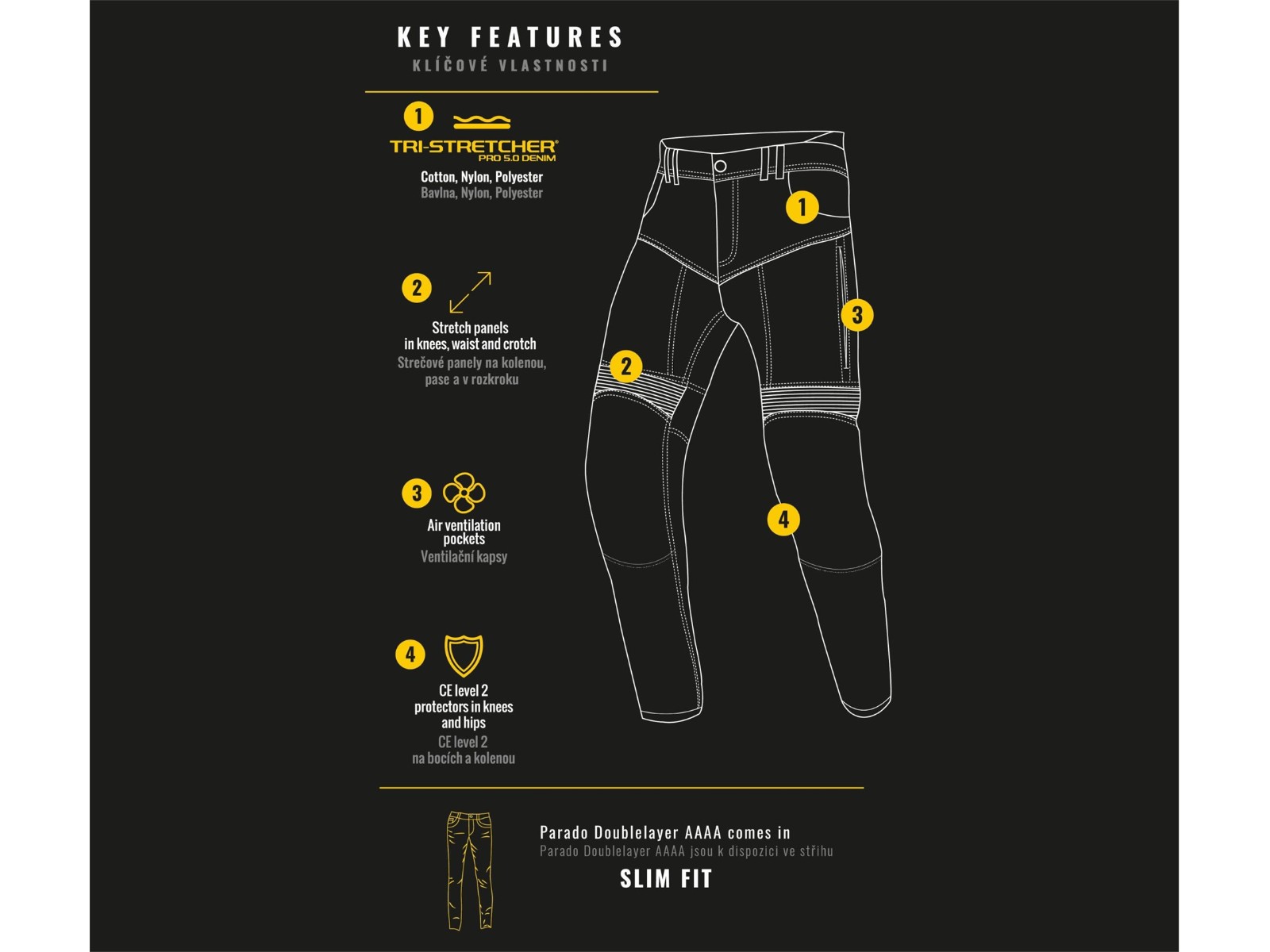 Die Trilobite Parado Herrenjeans in klassischem Blau kombiniert stilvolles Design mit höchster Schutzfunktion und Tragekomfort. Gefertigt aus Elastic Denim mit 98 % Baumwolle und 2 % Elastan bietet sie eine perfekte Balance aus Robustheit und Flexibilität. Im Inneren sorgt das innovative Tri-Stretcher® PRO 5.0 Denim-Futter für zusätzliche Bewegungsfreiheit und Komfort. Die Jeans ist nach der höchsten Schutzklasse CE AAA geprüft und mit herausnehmbaren CE LEVEL 2-Protektoren an Knien und Hüfte ausgestattet. Die Knieprotektoren lassen sich sowohl in der Höhe als auch seitlich individuell anpassen. Für optimalen Sitz und Ergonomie sorgen Stretcheinsätze an Knien, im Schritt und am Rückenbund, fünf praktische Taschen, doppelte Gürtelschlaufen an der Vorderseite sowie ein erhöhter Taillenbund im Rückenbereich. Belüftungstaschen an den Oberschenkeln und ein atmungsaktives Paneel im Schritt sorgen auch an warmen Tagen für ein angenehmes Klima. Die Trilobite Parado wird in einer wasserdichten Transporttasche geliefert und ist die ideale Wahl für anspruchsvolle Motorradfahrer, die auf Sicherheit, Komfort und Stil setzen.