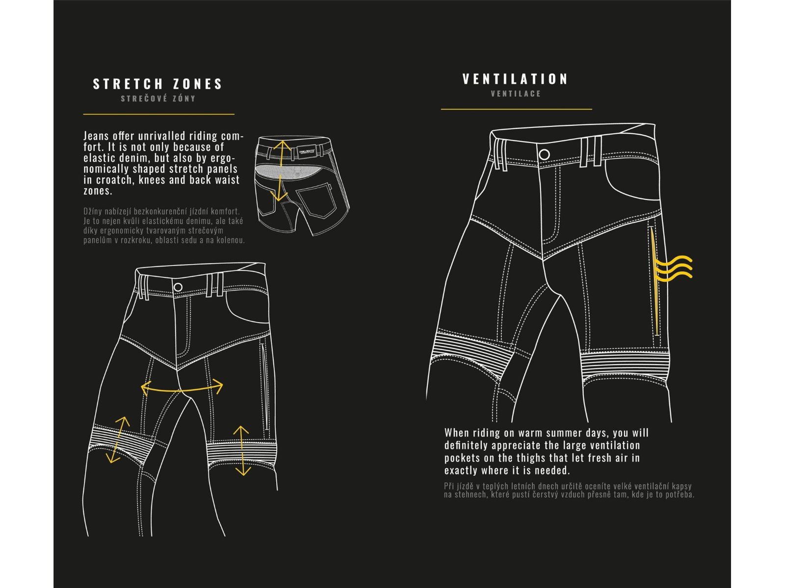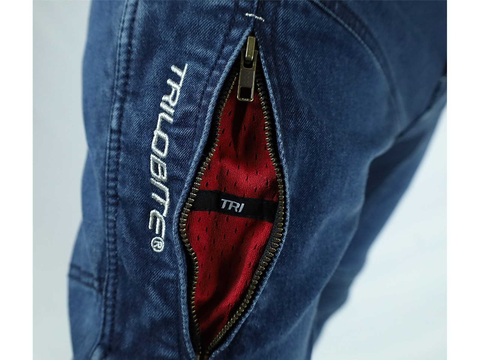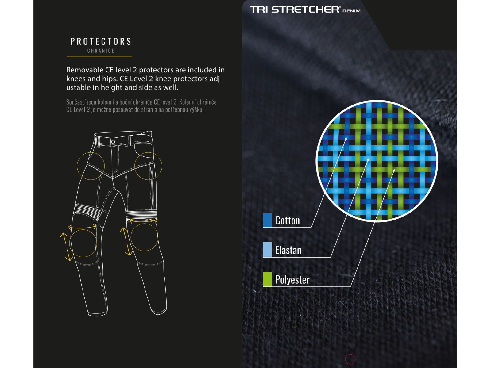 - Außenmaterial: TRI-STRETCHER® Pro 5.0 Denim (Dyneema®, Elastan, Polyester, Nylon und Baumwolle)
